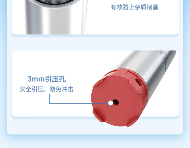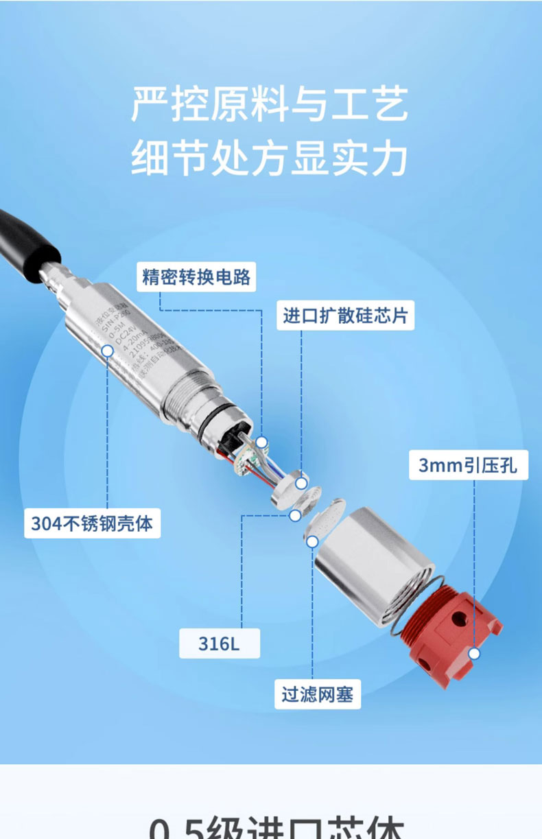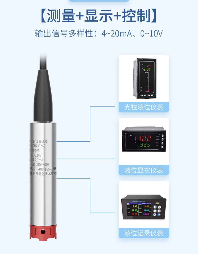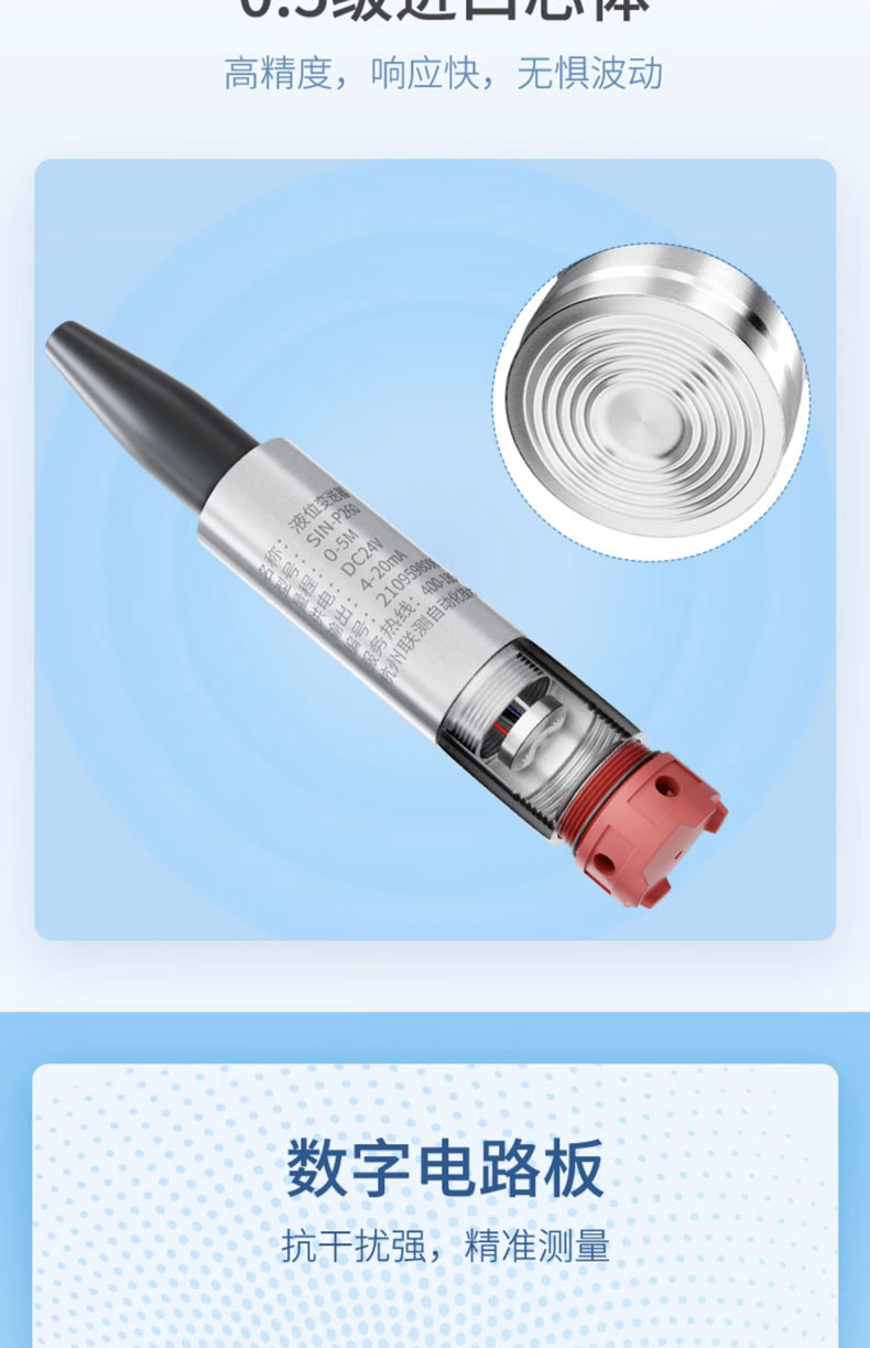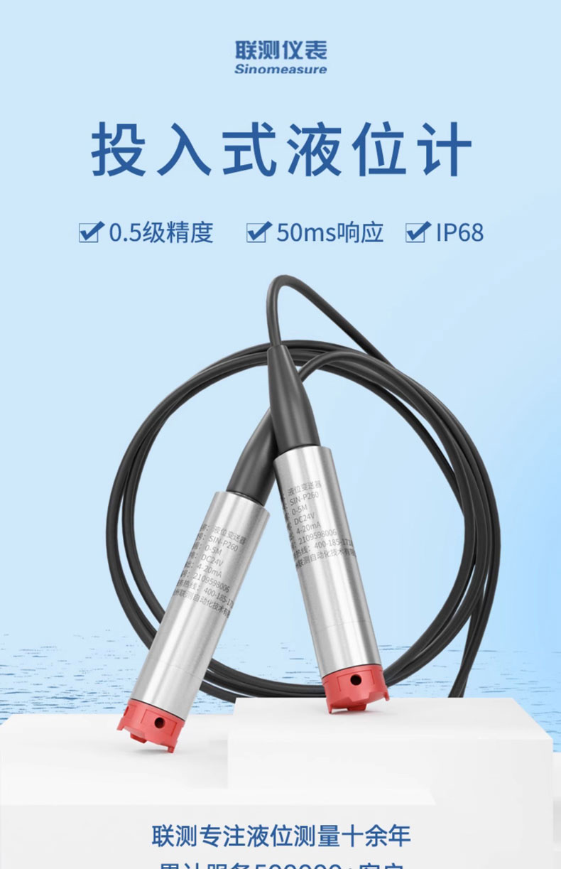 投入式液位計(jì)由高性能擴(kuò)散硅壓阻式壓力傳感器作 為測(cè)量元件,把與液位深度成正比的液體靜壓力準(zhǔn)確測(cè) 量出來(lái),并經(jīng)過(guò)信號(hào)調(diào)理電路轉(zhuǎn)換成標(biāo)準(zhǔn)(電流或電壓) 信號(hào)輸出,建立起輸出信號(hào)與液體深度的線性對(duì)應(yīng)關(guān)系, 實(shí)現(xiàn)對(duì)液體深度的測(cè)量。產(chǎn)品精度高、體積小,直接投 入液體中,即可測(cè)量出變送器末端到液面的液體高度, 使用方便。適用于石油、化工、 電廠、城市供水、水文 勘探領(lǐng)域的液位測(cè)量與控制。CN7